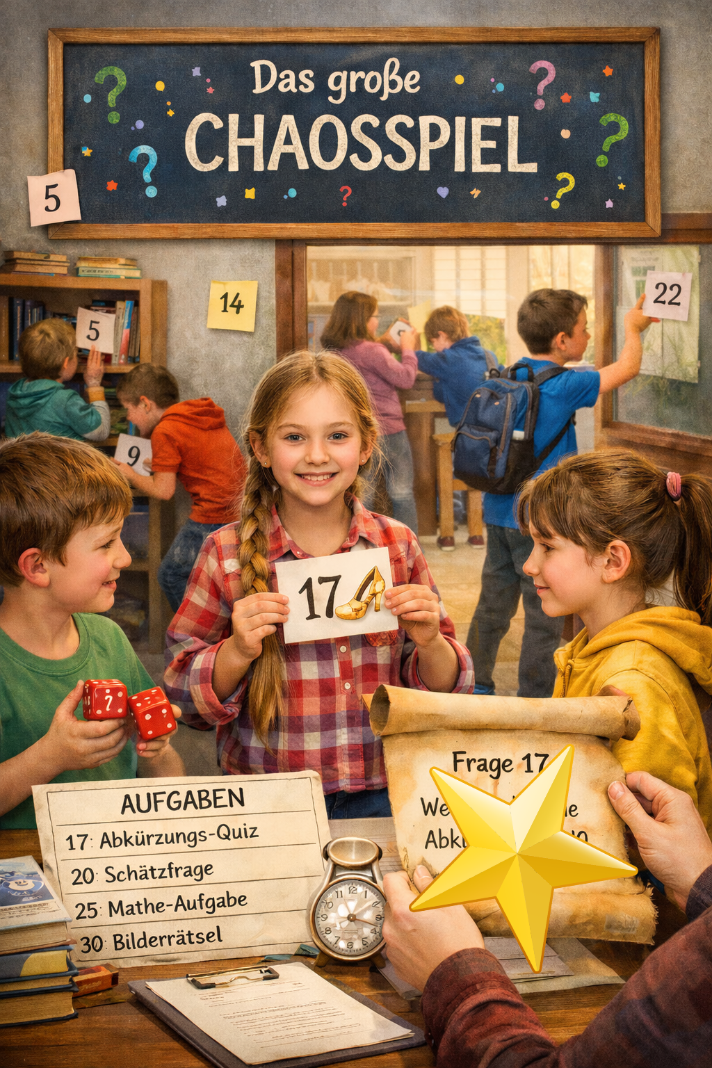 Beim Chaosspiel geht es rund: Würfeln, losrennen, Zahlen finden und gemeinsam Aufgaben knacken! Überall in den Räumen warten spannende Herausforderungen - da bleibt niemand lange sitzen.